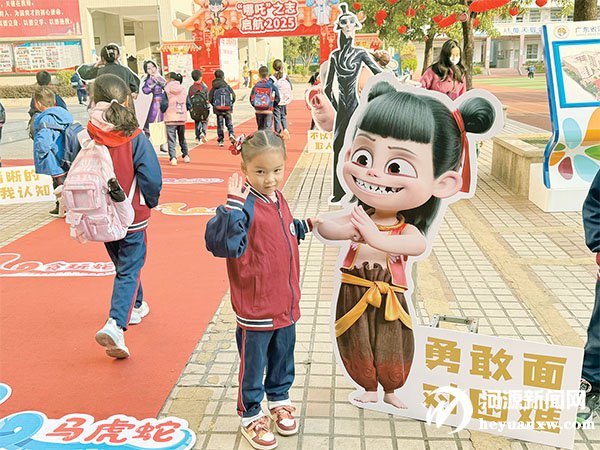 早上8時(shí),當(dāng)河源市第二小學(xué)的學(xué)生們歡快地踏入校門時(shí),校領(lǐng)導(dǎo)們?cè)缫言谛iT口等候,熱情地向?qū)W生們發(fā)放開(kāi)學(xué)“紅包”。開(kāi)學(xué)“紅包”除了裝有祝福語(yǔ),還有領(lǐng)讀券、免背誦券、管紀(jì)律券等趣味券,以及與校長(zhǎng)共餐券、免作業(yè)券、限時(shí)同桌券等特別獎(jiǎng)勵(lì)。等學(xué)生接過(guò)開(kāi)學(xué)“紅包”,他們的目光瞬間被一道亮麗的風(fēng)景線吸引——“哇!是哪吒!”一個(gè)身著紅肚兜、手持乾坤圈的小哪吒卡通形象立在校門口,引得學(xué)生們一陣驚呼,不少學(xué)生興奮地拉著家長(zhǎng)的手,喊道:“媽媽,我要和哪吒合影!”記者看到,步入校園,校道上五個(gè)以“拖延蛇”“馬虎蛇”“貪玩蛇”“依賴蛇”“自滿蛇”等命名的跨欄牌依次排列,學(xué)生一一跨過(guò),便寓意著在新學(xué)期能夠勇往直前,克服困難。同時(shí),寫著“‘哪吒’之志啟航2025”的哪吒主題門矗立在校道入口,門前還有《哪吒2》中主要角色的卡通形象展板整齊排列,對(duì)應(yīng)寫著清晰的自我認(rèn)知、家庭陪伴、正確交友、勇敢面對(duì)困難等標(biāo)語(yǔ),吸引學(xué)生駐足觀看。門口兩側(cè)的許愿區(qū)已經(jīng)貼滿了五彩斑斕的愿望卡,“我希望我能在新學(xué)年里更加勇敢自信”“祝爸爸媽媽永遠(yuǎn)年輕”“祝大家天天開(kāi)心”……每一張卡片上都承載著孩子們對(duì)新學(xué)期的美好祝愿和期待。